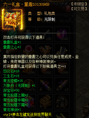2、童趣之心*1(集齊指定數(shù)量可兌換坐騎、戒靈、傳奇神器及神劍)